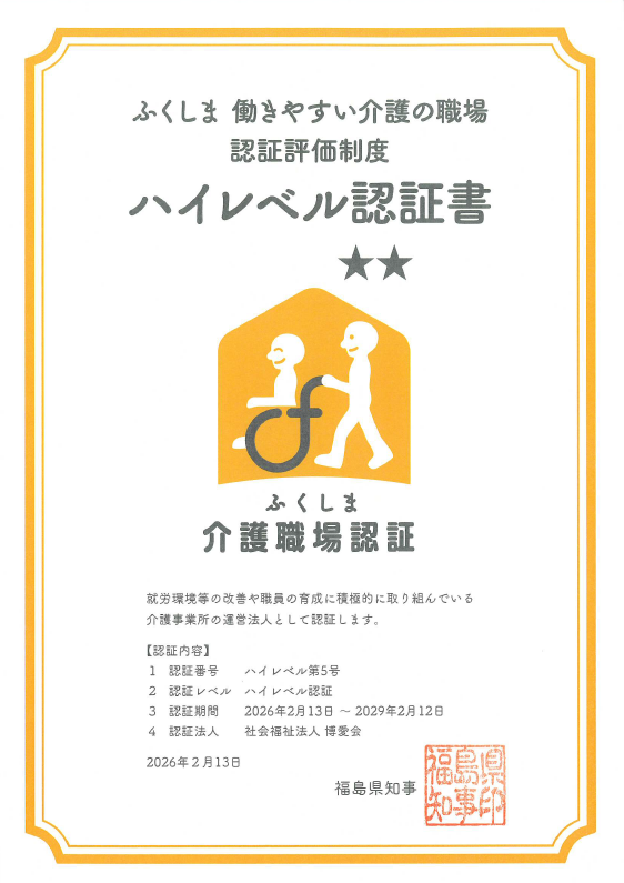 福島県より「働きやすい介護の職場」として、最高水準の『ハイレベル認証』をいただきました