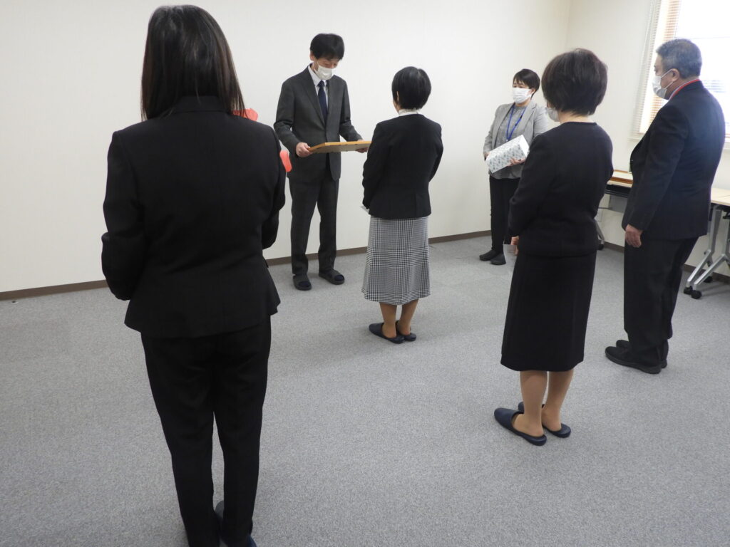 4名の皆様の長年の功績に感謝を込めて、記念品とともに感謝状を贈らせていただきました。